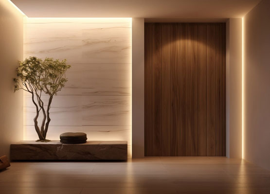 LED backlighting | Marble base platforms | Mirror backdrops | Bells and brass accessories | Sliding doors